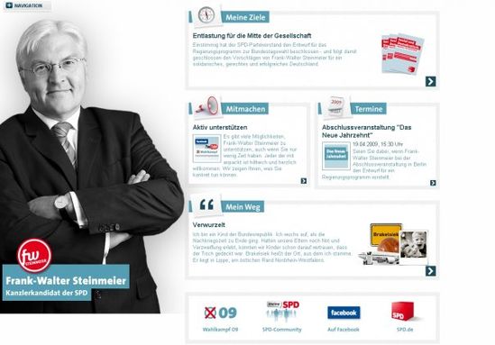 Mit Frank- Walter Steinmeier hat die SPD einen im Netz sehr glaubwürdigen Kandidaten, der iPhone, Internet und Laptop auch privat intensiv nutzt. Von Bürgerferne der Politik ist im Onlinewahlkampf der SPD keine Spur. Im Gegenteil: Frank- Walter Steinmeier hat das Netz verstanden und weiß es zu nutzen: Auf wahlkampf09.de bloggt er und seine Homepage zeigt sich in Design und Konzept als wegweisend für moderne, personalisierte und sozialdemokratische Kommunikation im Netz.