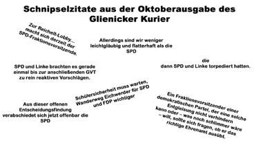 Diese Zitatschnipsel aus der letzten Ausgabe des „Glienicker Kurier“ sind nur einige Auszüge davon, wie einige Glienicker Kommunalpolitiker derzeit meinen, mit ihrem politischen Mitbewerbern umgehen zu müssen. Dass nicht immer alles stimmt, was Einige meinen schreiben zu müssen, daran haben wir uns inzwischen gewöhnt.