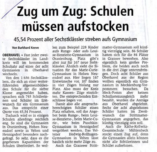 Es ist nicht hinnehmbar, wenn das Brandenburger Bildungsministerium uns sinngemäß mitteilt, dass der Landkreis als Verantwortlicher für die Bildung im Landkreis Oberhavel seiner Pflicht mit dem Ausbau der Mühlenbecker Oberschule in eine Gesamtschule mit gymnasialer Oberstufe ausreichend nachgekommen ist. Man erinnere sich, welcher Aufwand notwendig gewesen ist um den Kreis von diesem dringend notwendigen Ausbau der Kapazitäten ab der siebten Klasse zu überzeugen. Dies gelang nur, nachdem die zu diesem Zeitpunkt unter Führung der SPD stehenden Sozialausschüsse eine richtungweisende Zusammenarbeit in der Schulpolitik vereinbarten. Doch auch diese Ausweitung der Kapazitäten für die Sekundarstufe I und II reicht nicht aus.
